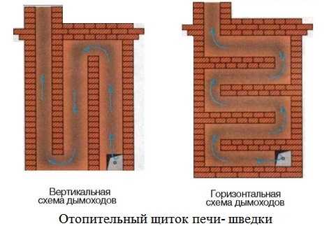 Avec une disposition verticale des conduits de gaz en suédois, il peut y avoir une trappe de nettoyage. Mais il y a un autre problème: pendant que le four est chauffé, dans le premier canal, du côté où les gaz chauds du four entrent, le bouclier sera sensiblement plus chaud que dans le troisième - à la sortie. Le volet étant généralement situé dans deux pièces, l'une d'entre elles sera beaucoup plus chaude que l'autre.