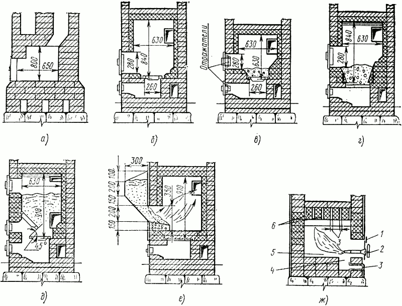 Conceptions de foyers de fours : a - avec foyer sourd ; b, c - avec une grille; d - avec un arbre et une grille; d - avec une grille fortement inclinée; e - spécial; g - pour le gaz; 1 - avant du four; 2 - brûleur à gaz; 3 - un ventilateur; 4 - ouverture dans le foyer; 5 - chambre de combustion; 6 - buse