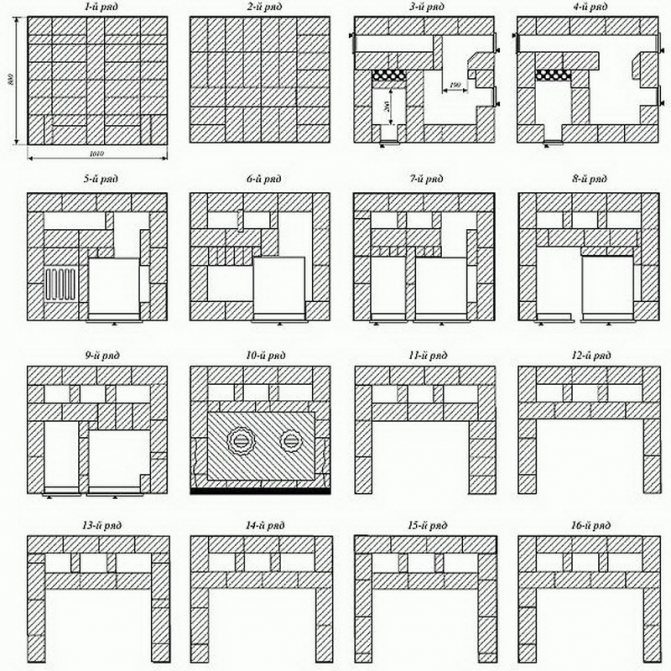 5ème rangée. Toutes les portes et canaux sont clôturés avec des briques, alors qu'il est nécessaire de laisser de l'espace pour la grille, qui sera installée plus tard. Pour couvrir la chambre à cendres seules des briques en argile réfractaire sont utilisées... Pour effectuer ces travaux, vous aurez besoin d'une brique ordinaire d'un montant de 16 pièces. et réfractaire - 8 pièces.