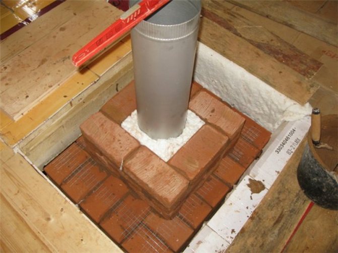 Après avoir disposé toutes les rangées, le tuyau est construit. Principalement droit, ce qui ne change pas les dimensions de la section transversale. Sur le sol technique ou le grenier, le tuyau en brique se transformera en un tuyau en métal. La taille de la section intérieure ne devrait pas être sujette à changement pour cette raison. Compte tenu des règles de sécurité incendie, à l'intersection de la cheminée et du plafond, un duvet est installé.