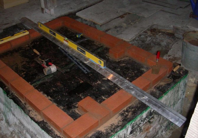 - L'uniformité de la maçonnerie est examinée le long et en travers. Le niveau aidera à cela, et les coins détermineront l'échelonnement des coins du four.