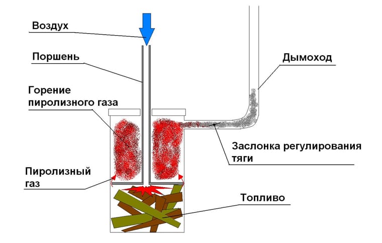 Pour augmenter l'efficacité du four, il est souvent équipé de double chambre de combustion - Ceci permet étendre action d'un signet de bois de chauffage pendant 12 à 18 heures... Ceci est réalisé grâce au processus pyrolyse - en raison de l'entrée d'air contrôlée dans le four, le bois ne brûle pas dans une flamme nue, mais couve très lentement, émettant une grande quantité de fumée et de gaz chauds. Deuxième chambre le four est utilisé pour la combustion finale des produits de combustion libérés.