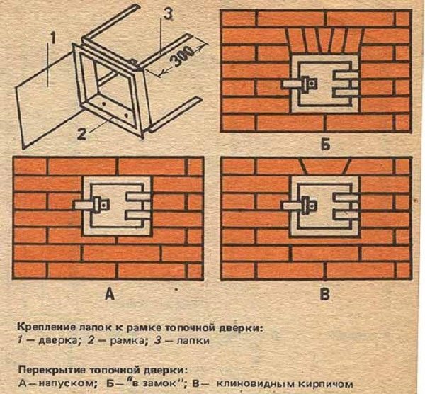 2. Une chambre de combustion pour le remplissage et un cendrier pour l'élimination des déchets sont créés. Le processus est effectué selon le schéma. Les 4 rangées de départ du bâtiment sont en brique rouge. Pour l'adhérence, une solution sur argile est utilisée et une porte de cendrier en fonte est montée.