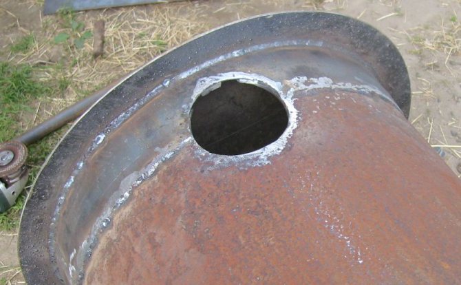 - Dans l'élément découpé, vous devez percer un trou d'un diamètre de 10 cm et y souder un tube en acier de la même taille.