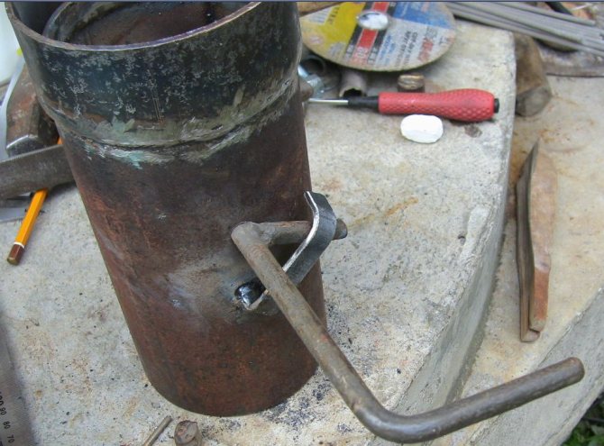 - Sur la partie supérieure, nous soudons une pièce à connecter à la cheminée. Nous y faisons un petit trou à partir du bord et insérons une tige d'un diamètre de 8 à 10 mm. Nous allons fabriquer une vanne à guillotine à partir d'une feuille d'une épaisseur de 6-8 mm en y découpant une petite rainure. La porte est soudée à une barre qui est pliée à angle droit.
