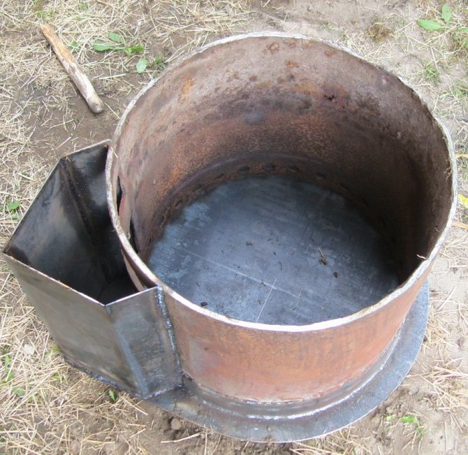 - Au bas de l'appareil, vous devez faire un petit trou carré, puis y souder la porte. Ce sera un bac à cendres - une trappe pour collecter les cendres, où la boîte est installée pour plus de commodité et de facilité de nettoyage.