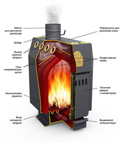 Pourquoi nous avons décidé d'aborder le sujet des caractéristiques de conception. Après tout, il a déjà été mentionné que c'est l'idée d'un fabricant national. Tout est ainsi, mais l'auteur du développement a été poussé à l'invention du célèbre four canadien Bulleryan. Donc, ils semblent être complètement différents? Extérieurement - oui, mais la structure interne est même très bonne. Bien sûr, nous devons rendre hommage aux ingénieurs russes qui ont rappelé le Canadien, l'ont rendu plus économique et plus efficace. Par conséquent, il était nécessaire de modifier certaines des positions constructives.