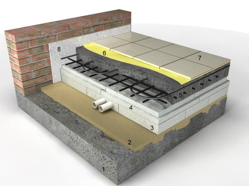 Disposition des carreaux sur une base de ciment. 1 - base, 2 - couche de sable, 3-4 - couches, 5 - chape en béton, 6 - colle à carrelage, 7 - carrelage, 8 - couche de séparation.