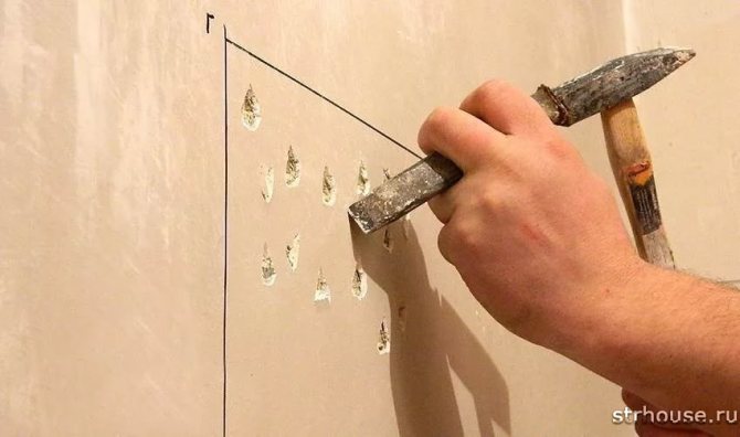 - La qualité de la couche de plâtre, le cas échéant, est nécessairement vérifiée. Toutes les zones problématiques et délabrées sont éliminées immédiatement. Il est nécessaire de taper sur toute la zone, pour identifier les lieux d'instabilité, qui doivent également être supprimés. Et le plus souvent, il arrive que si une zone exfoliante se trouve dans une zone, tout le reste en sera retiré, c'est-à-dire que l'emplâtre doit être complètement abattu.
