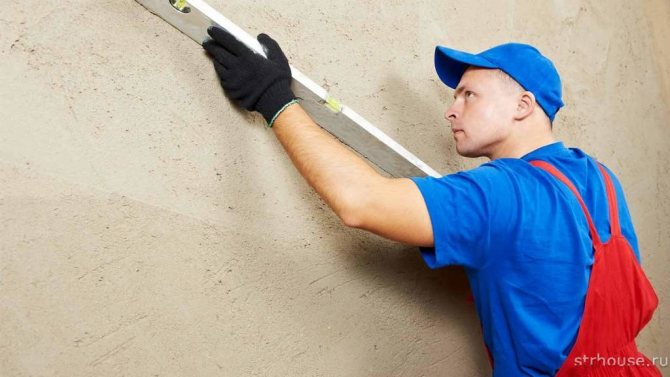 | Comme déjà mentionné, il est préférable de travailler (surtout en l'absence d'expérience) sur des murs plats. Ici, tout semble aller bien, mais cela ne fait jamais de mal de vérifier. Par conséquent, le travail commence par le contrôle - vérifier la verticalité du mur. | |