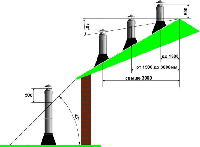 - Hauteur de la cheminée - 500 mm au-dessus du point le plus élevé du toit avec une distance de faîte jusqu'à 150 cm.