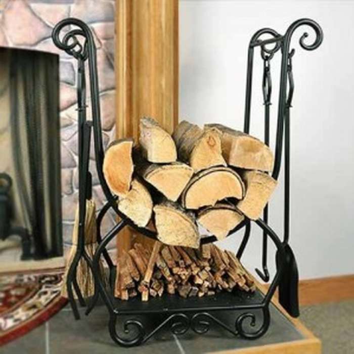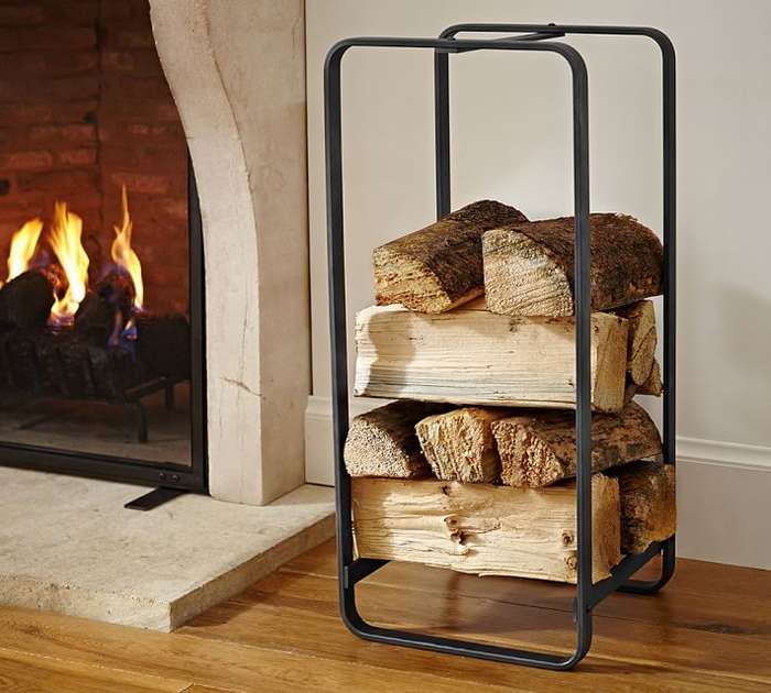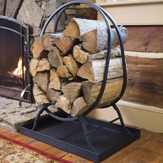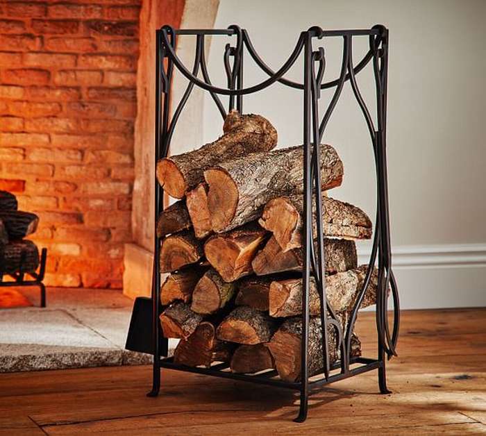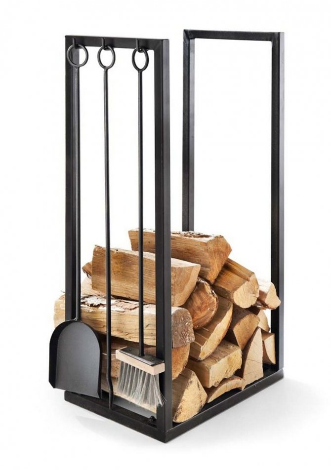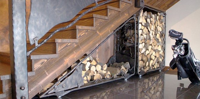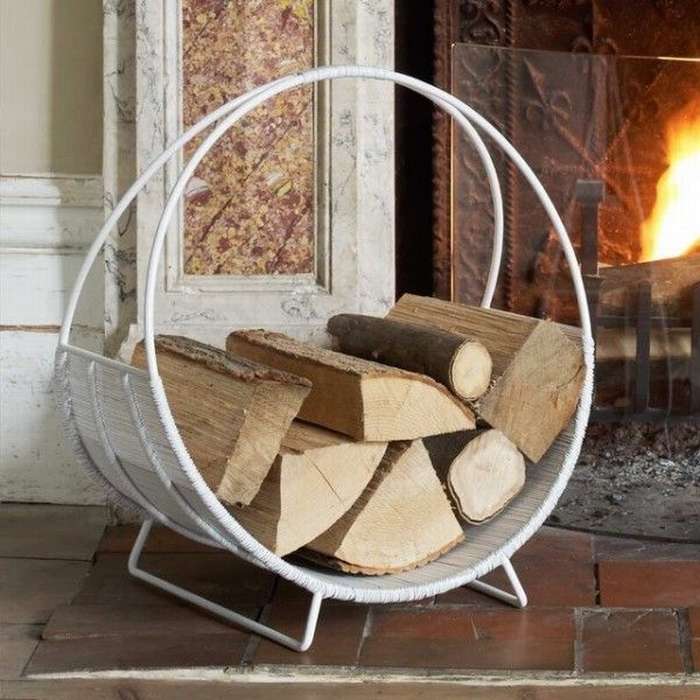- Solutions de salle: fixes et portables. Il est impossible d'effectuer un stockage à part entière du bois de chauffage dans la maison en raison de l'espace limité. Vous pouvez organiser un petit entrepôt sous les escaliers, mais il vaut mieux ne pas occuper un espace précieux avec du bois. Le plus souvent, à côté du poêle ou de la cheminée, il y a un bois de chauffage impromptu pour une petite quantité de bois de chauffage, qui peut être utilisé pour allumer un feu et chauffer la pièce. Ce poêle à bois peut faire partie du poêle lui-même, cela peut être une cheminée avec un poêle à bois sur le côté ou avec un support à l'intérieur, un petit entrepôt peut être réalisé sous la forme d'une étagère à bois sur le mur. Les bûches de cheminée peuvent être placées séparément et ressemblent à un accessoire décoratif à part entière. Dans les magasins, vous pouvez trouver des options en bois, en métal et en plastique; une belle forgeage est très souvent utilisée. Le plus simple peut être une option portable, par exemple un panier en osier ordinaire, avec lequel vous pouvez facilement vous rendre au hangar pour reconstituer les stocks de bois de chauffage.