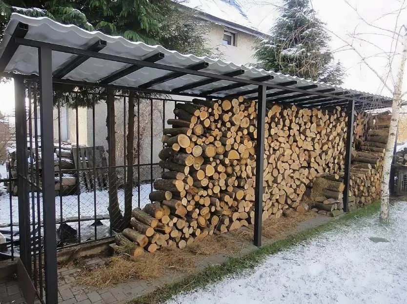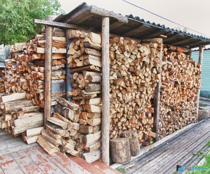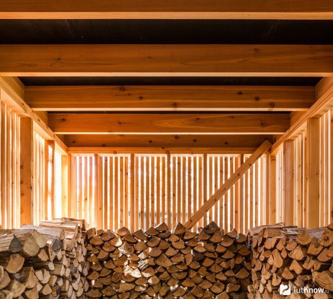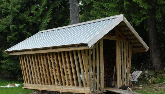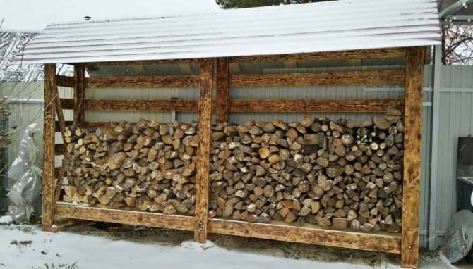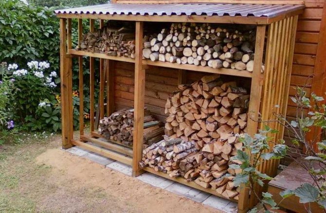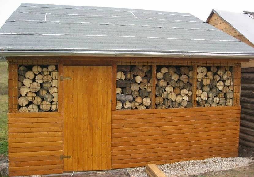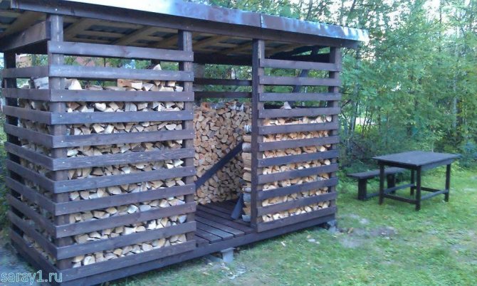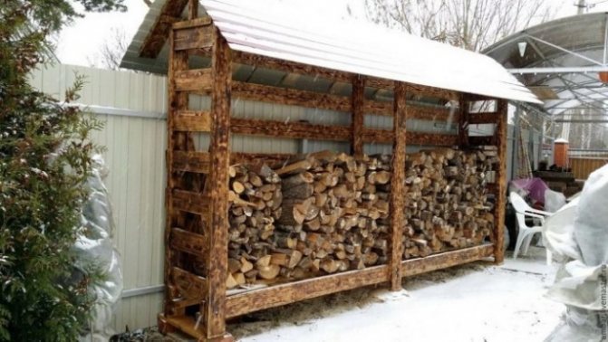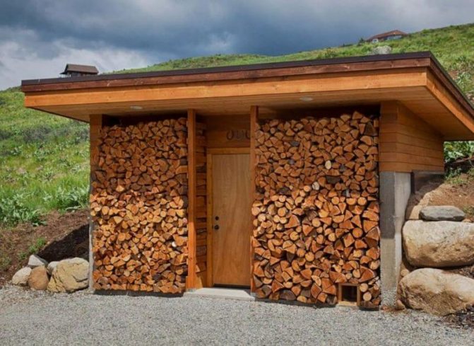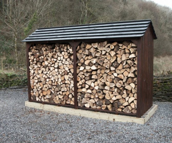 - Options de rue. Pour stocker le bois de chauffage dans la rue, de petites structures en forme de hangars sont le plus souvent construites. Ces hangars protègent la forêt des précipitations et lui donnent en même temps la possibilité de ventiler, sécher, car il y a des fissures dans les murs des structures. De plus, le bois n'est pas posé sur le sol ou le sol, mais sur une base préparée qui ne permet pas à l'humidité de pénétrer sur le bois. Dans certains cas, le tas de bois est réalisé sous la forme d'un auvent, qui est fixé sur les piliers. La verrière protège le bois des précipitations et l'absence de murs permet au bois de sécher du vent.
