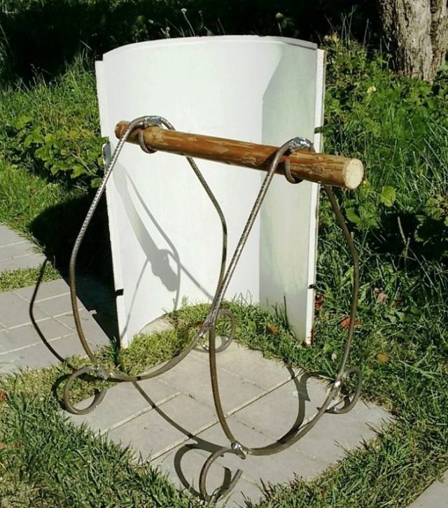 - Parmi les matériaux, trois tiges de renfort d'une longueur de 1500 mm, d'un diamètre de 7 ÷ 8 mm, ainsi qu'une feuille de métal d'une épaisseur de 0,5 ÷ 1,0 mm et d'une taille de 600 ÷ 800 mm seront nécessaires. De plus, vous aurez besoin d'une tige en bois bien travaillée d'un diamètre de 25 ÷ 30 mm et d'une longueur de 500 mm.
