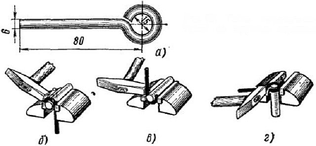 | Ensuite, la poignée finie est insérée dans des anneaux fixés au sommet des ébauches métalliques. La distance entre les flans doit être égale à la distance entre les rainures découpées dans le panneau de palette. Après avoir installé la poignée et réglé la suspension à la distance souhaitée, leurs anneaux doivent être pressés pour que le métal s'adapte parfaitement au bois. Le sertissage se fait avec un marteau. Les anneaux ne doivent pas bouger le long de la poignée. |