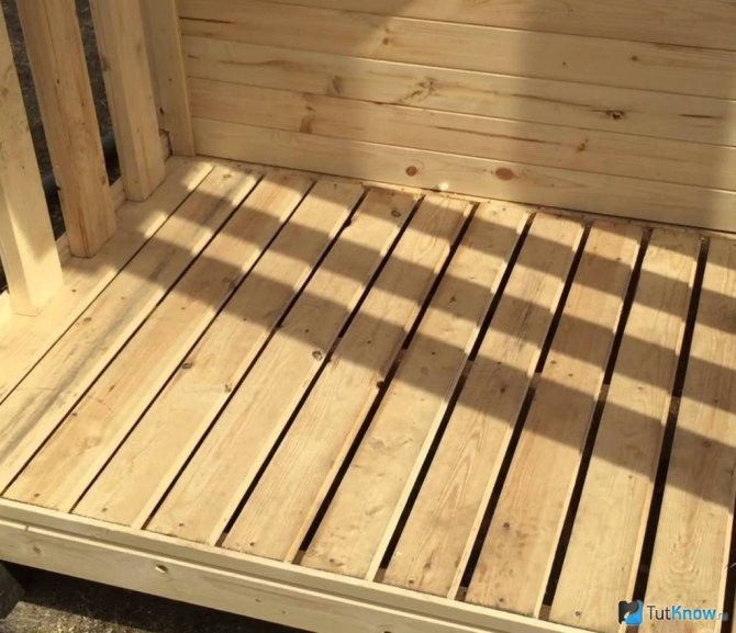 - Nous renforçons le sol avec des bûches et fixons les lattes de 2 cm d'épaisseur avec des vis autotaraudeuses.