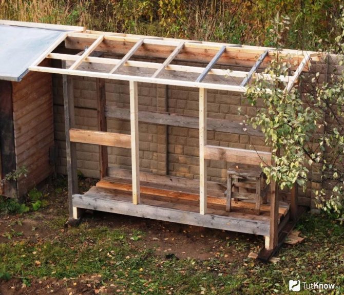 Construire une sorte de grange massive est totalement inutile. Vous érigez simplement un hangar local et mettez-y la quantité de bois de chauffage nécessaire pour 2-3 incendies. Un auvent mural est le moyen le plus simple et le plus abordable de l'aménager. Le nombre approximatif de bûches est au niveau de la croissance humaine, mais la longueur peut être différente et dépend directement de la longueur du bain lui-même.