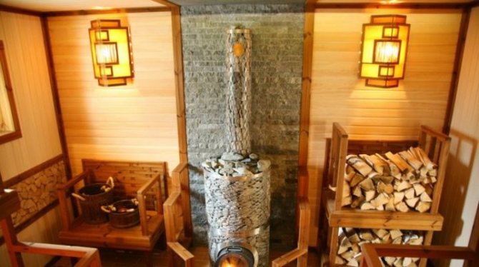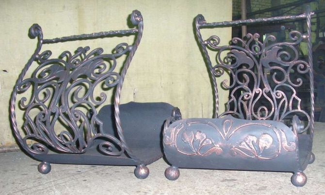 ... Les appareils externes sont en métal, qui doit être traité avec une solution anticorrosion. Souvent, des boîtes en bois forgé pour un bain sont placées comme supports décoratifs pour le bois de chauffage dans le dressing. - Osier