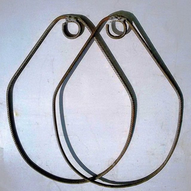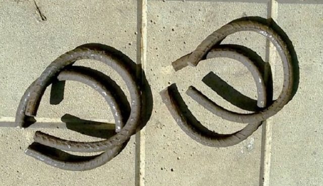 | La première étape consiste à fabriquer deux anneaux identiques d'un diamètre intérieur de 25 ÷ 30 mm. Il est préférable de faire ce processus avec une cintreuse de tuyaux, mais cet outil, en règle générale, n'est disponible que pour les professionnels. Par conséquent, vous pouvez utiliser un étau, un marteau et un gabarit de tube préparé. La tige de renfort avec le tuyau est serrée dans un étau. Puis, en tapotant progressivement la tige autour du tuyau, elle se plie en anneau. Après cela, la partie excédentaire de la tige est coupée avec une meuleuse. Les anneaux de ce diamètre nécessiteront 2 pièces. |