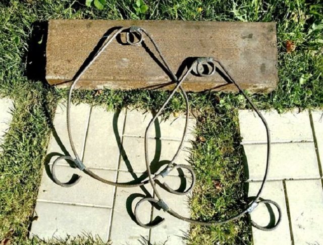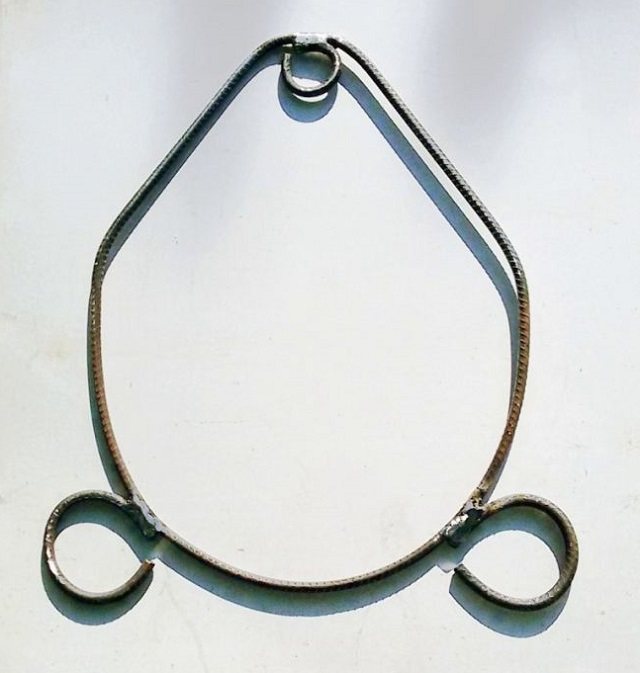 | En outre, deux boucles sont formées à partir des tiges - pendentifs. Ils peuvent être ronds ou trapézoïdaux. Ces ébauches formeront la partie porteuse de la structure. Si la forme représentée sur l'illustration est choisie, sa partie inférieure se présente sous la forme d'un demi-cercle d'un rayon de 200 mm. Au bout du demi-cercle, les extrémités de la tige sont inclinées, puis se plient en haut, formant un demi-cercle d'un diamètre de 60 mm. Dans la partie supérieure, les extrémités de la barre sont fixées les unes aux autres par soudure. Après cela, en haut, de l'intérieur des charnières, des anneaux préalablement préparés d'un diamètre intérieur de 25 ÷ 30 mm sont soudés. Dans ce cas, l'espace entre les extrémités de la tige qui a formé la bague doit rester ouvert. Ces anneaux sont conçus pour s'adapter à la poignée en bois du support en bois. |