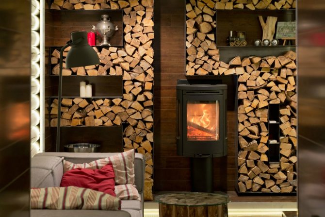 Par exemple, juste dans le mur à côté du poêle, vous pouvez créer une niche dans laquelle vous pouvez charger du bois pour le stockage et le séchage. Si les dimensions du poêle ou de la cheminée sont grandes, vous pouvez envisager l'option avec une niche à l'intérieur. Habituellement, une telle niche est située dans la partie inférieure de la cheminée, du poêle, la concevant même avant la pose, en train de développer l'apparence de toute la structure.