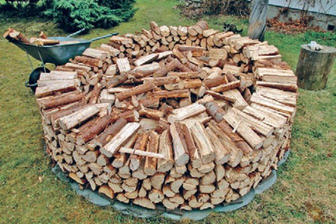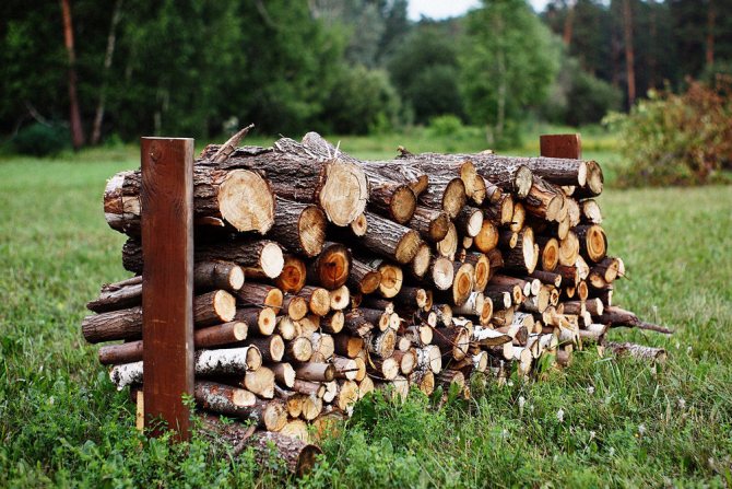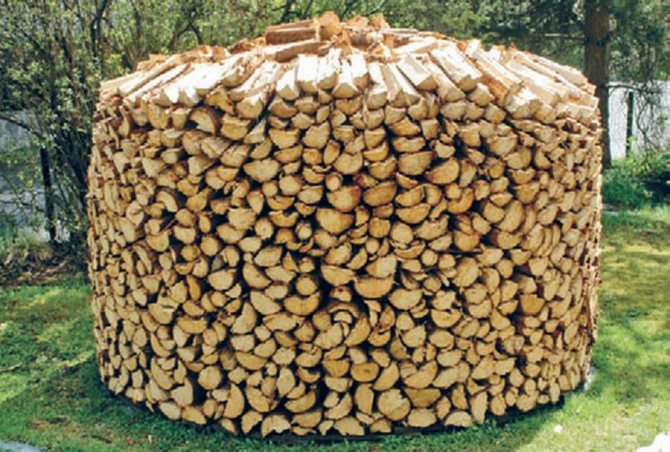 L'empilement des journaux en piles est souvent utilisé. Pour ce type d'installation, une assistance est requise. Un mur d'une maison, d'un bain public ou d'un autre bâtiment convient comme support; grille à bois pour donner. Lors de la pose, contrôler strictement la pente vers le support. Si vous posez sur deux rangées, placez des bûches plus minces sur le support et des bûches plus épaisses à l'extérieur. En raison de la différence de taille, un biais vers le support sera obtenu.