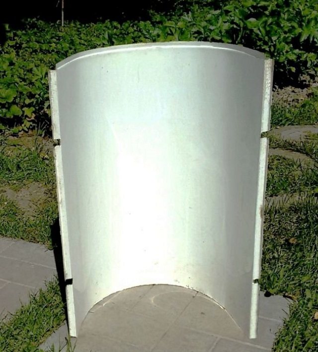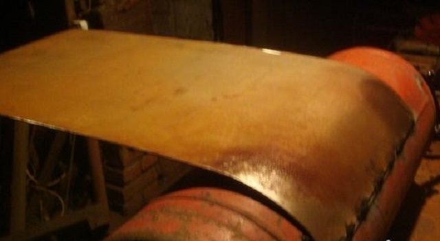 | La tôle doit être pliée. Pour ce processus, un redressage (gabarit) est utilisé, qui a une forme cylindrique et un rayon dépassant le rayon du demi-cercle de la partie inférieure des flans, car la feuille doit y rester par la colonne vertébrale. Comme gabarit, vous pouvez utiliser une bûche uniformément rabotée, une coupe de tuyau de grand diamètre ou une bouteille de gaz vide. |
