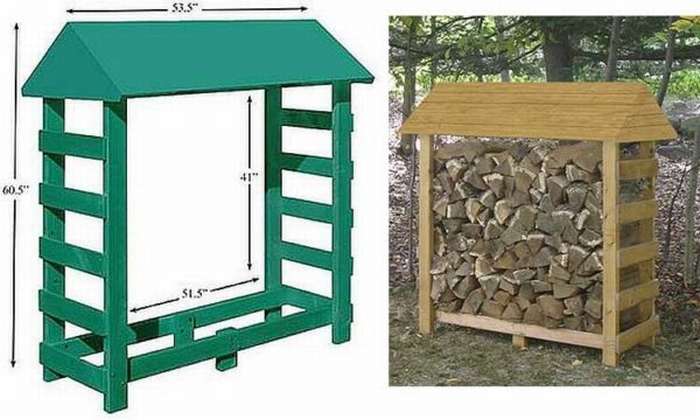 Vous devriez avoir un rectangle de 2,50 x 1,80 m et deux pièces murales. La structure doit "respirer", c'est important pour le stockage du bois de chauffage à l'air libre. Le dégagement entre le sol et la terrasse favorise la circulation de l'air et maintient le bois au sec