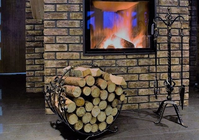 Les boîtes à bois de chauffage peuvent être en brique, pierre, métal, bois massif, contreplaqué, corde, verre, ainsi que leurs combinaisons. Ils peuvent être décorés avec divers éléments décoratifs et ornements. Les magasins vendent des kits de cheminée prêts à l'emploi, qui comprennent des porte-bûches et d'autres accessoires nécessaires. Un tel ensemble peut être facilement fabriqué à la main.Parmi les pièces supplémentaires pour les cheminées, il y a aussi du bois de chauffage en céramique, mais il est catégoriquement impossible de les chauffer avec elles - elles remplissent une fonction purement décorative.