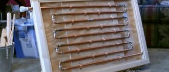 | Si un panneau avec des bords pliés rigides le long des bords est utilisé pour former une palette semi-cylindrique, comme dans cet exemple, des rainures sont marquées sur ses côtés longs et coupées exactement en face l'une de l'autre. Leur largeur dépendra du diamètre de la barre d'armature à partir de laquelle les ébauches de base sont fabriquées. La distance entre les espaces de découpe dans cette conception est de 300 mm. Cependant, il peut être choisi à la discrétion du maître, et en fonction de la longueur des bûches les plus courtes que vous envisagez de transporter dans le stand. |