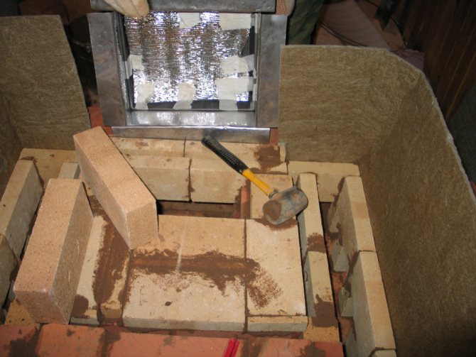 Ensuite, vous devez commencer à construire la chambre de combustion, puis continuer à élever les murs extérieurs. De cette manière, il est beaucoup plus pratique de maintenir les dimensions requises du four à haute température et d'ajuster les dimensions des espaces thermiques entre celui-ci et la paroi extérieure.