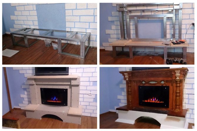 Dans les appartements, le plus souvent, ils construisent de leurs propres mains des portails pour une cheminée électrique. Dans ce cas, tout matériau disponible convient: bois, stratifié, gypse, plaques de marbre artificiel.