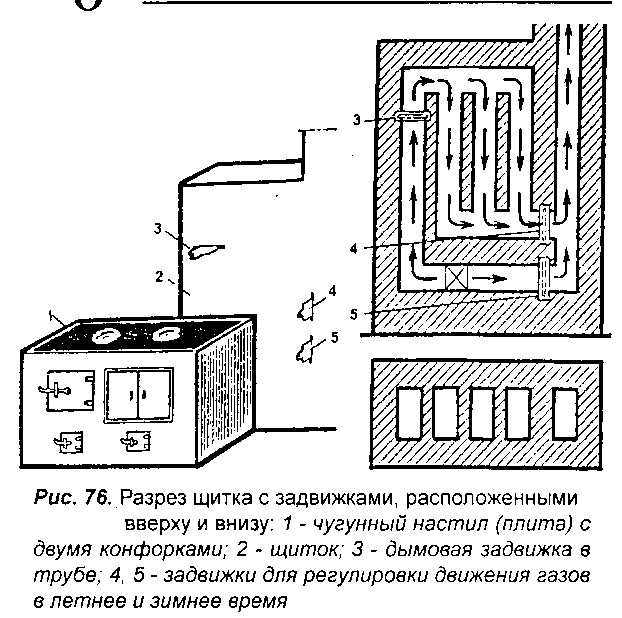 La plaque chauffante doit être réglée différemment pour un fonctionnement en été et en hiver. Cela vous permet d'utiliser uniquement la plaque de cuisson dans la chaleur sans chauffer les murs, et en hiver d'obtenir le chauffage maximum possible. Le principe de fonctionnement ressemble à ceci: dans la version d'été, les passages de fumée sont bloqués au moyen d'une vanne, à la suite de laquelle seul le poêle chauffe, et en hiver la vanne est repoussée, ce qui donne une impulsion à chauffer toute la surface du bouclier.