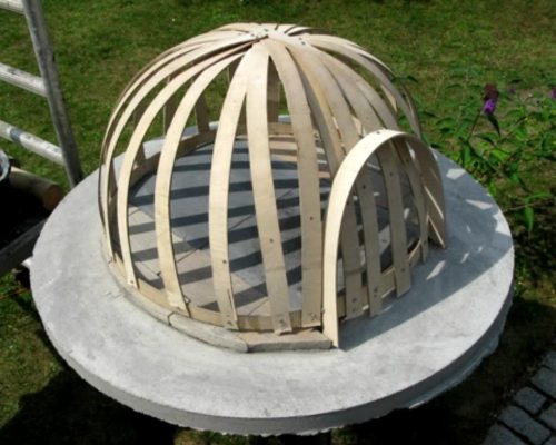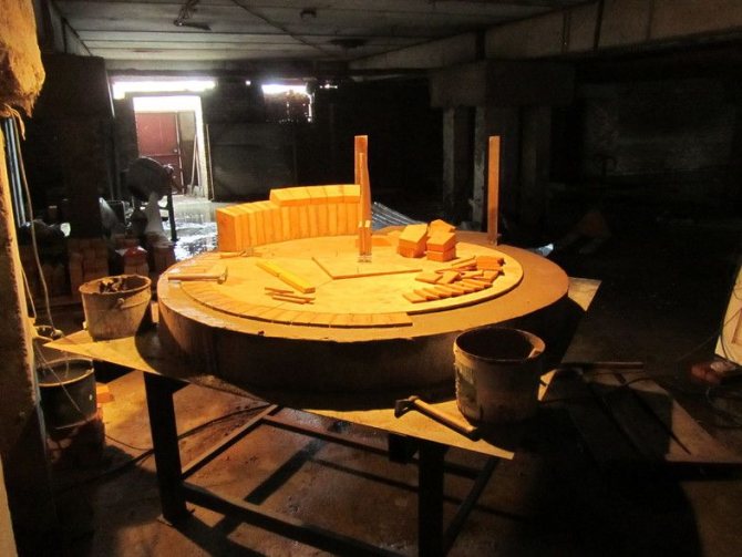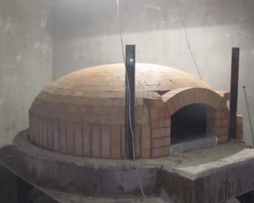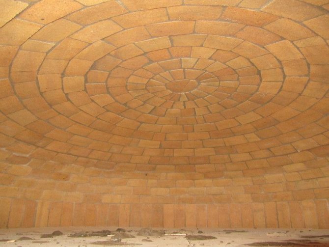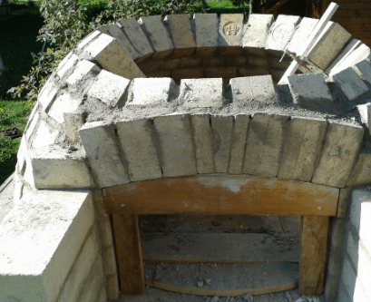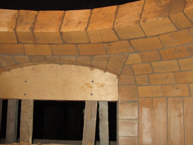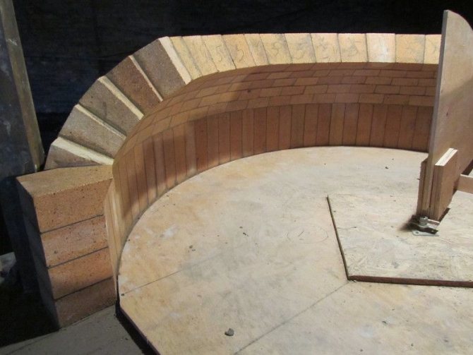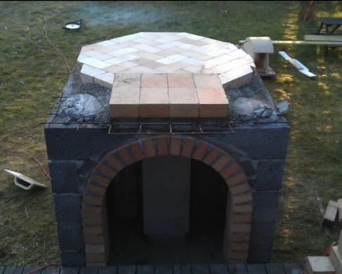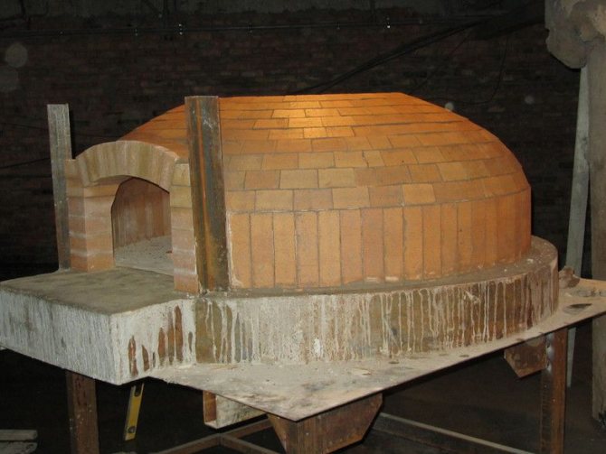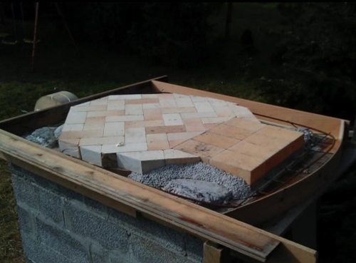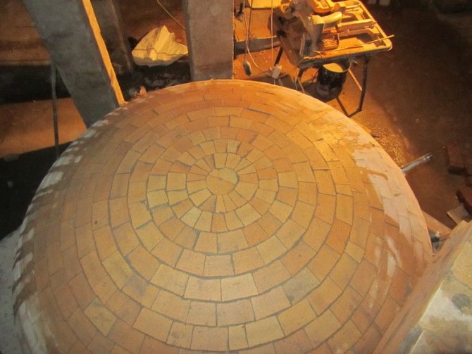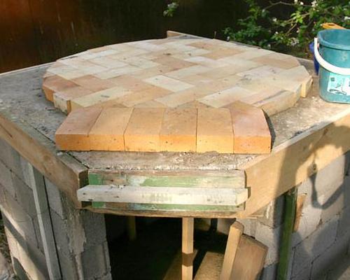 Sous le four, il est composé de briques en argile réfractaire, qui sont coupées sur les bords de manière à former un cercle. Les fentes (pas plus de 1 cm) sont remplies de mortier et tout est soigneusement nivelé. Commence alors la construction du dôme. Le point d'entrée est déterminé, un cadre en métal, en bois ou en mousse est installé ici. Le cadre en bois et en mousse doit être retiré une fois la construction terminée. La première rangée du dôme est disposée à partir des moitiés de la brique, puis, en damier, la 2e rangée. Les rangées suivantes sont disposées de manière à former une pente vers le centre de la chambre de combustion. Cela se fait à l'aide de briques ou de cales en bois. Certains artisans s'assurent en installant un gabarit en mousse ou, encore plus simple, une boule gonflable en caoutchouc au milieu du four. Une fois la maçonnerie sèche, tous les corps étrangers sont retirés.