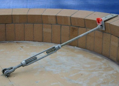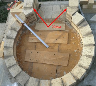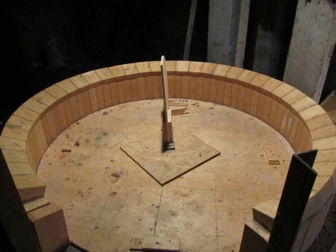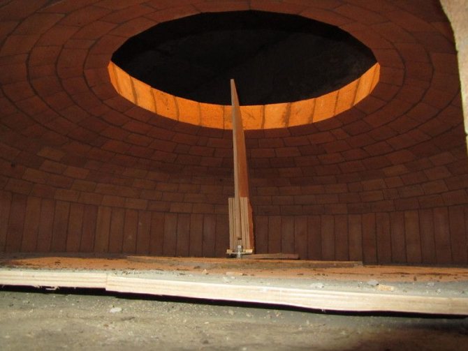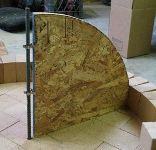 | Installation du patron. Ici, un axe métallique est installé au centre et un secteur découpé dans une feuille OSB ou un contreplaqué y est attaché. La conception est assez pratique, car vous pouvez fixer plusieurs de ces secteurs et les déplacer calmement vers la partie du dôme en cours d'aménagement. L'axe lui-même est sorti par le haut, avant de mettre la dernière brique ronde, le dôme de fermeture, et les secteurs sont facilement accessibles par la sortie, le trou au centre est barbouillé. |