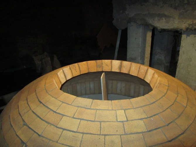 | Couronne de dôme. La couronne, en règle générale, est fermée avec des coins faits maison, mais un fabricant de poêles expérimenté m'a conseillé d'acheter un disque de brique en argile réfractaire prêt à l'emploi et de l'insérer (il y en a dans les magasins). |