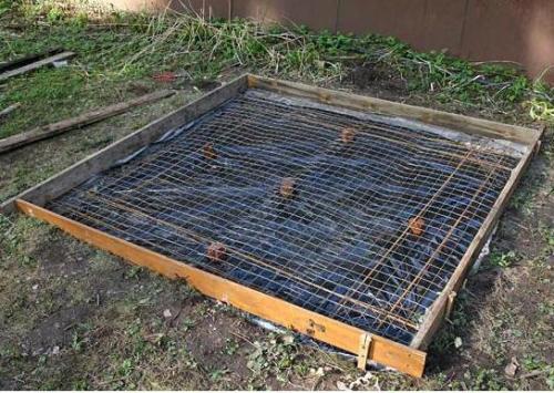| Renfort de plaque de base. L'épaisseur standard de la plaque de base est de 100 mm, mais nous réalisons le coffrage de 200 mm de haut. Initialement, une feuille de contreplaqué imperméable ou d'OSB est placée sur le podium et une boîte de coffrage est déjà renversée le long de celle-ci. Ensuite, tricotez une cage de renfort et placez-la à l'intérieur. Cette cage s'élève à une hauteur de 3 à 4 cm, toujours à l'aide de blocs de briques cassés.