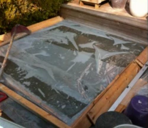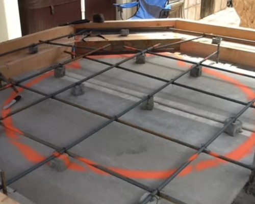 | Coulage du béton. Le béton est coulé le long du périmètre du foyer et nivelé avec une règle de plâtrage de sorte que la dalle soit dans le même plan que le foyer. Lorsque le béton durcit, le coffrage est retiré et le four peut être posé.