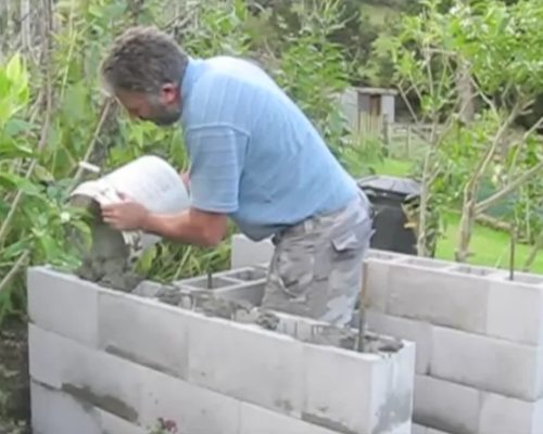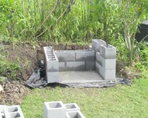 | Renforcement du podium. J'ai fait un podium avec une hauteur de 4 parpaings, soit 800 mm, si cela vous semble un peu, vous pouvez faire 5 parpaings (1 m), mais pas plus, car au dessus il y aura aussi un socle plaque de 200 mm d'épaisseur. Le parpaing est un matériau creux et pour augmenter sa résistance, j'y ai en outre inséré un renfort et coulé du béton sur le dessus. |