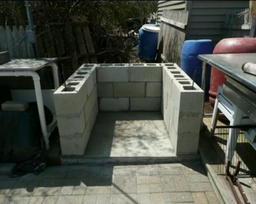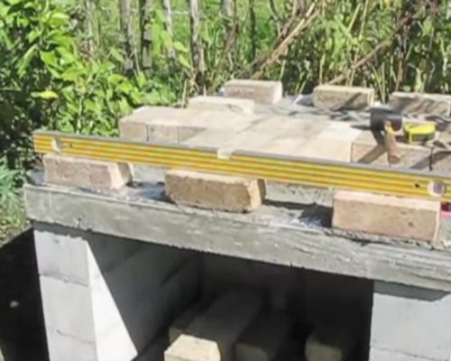 | Nous commençons à poser le podium. J'ai disposé le podium à partir d'un parpaing et l'ai fait sous la forme de la lettre "H", Cette conception est plus stable, la barre transversale au milieu prend une partie importante du poids du four. Vous pouvez faire un podium de briques de parement, mais une telle maçonnerie coûtera 2 fois plus cher.