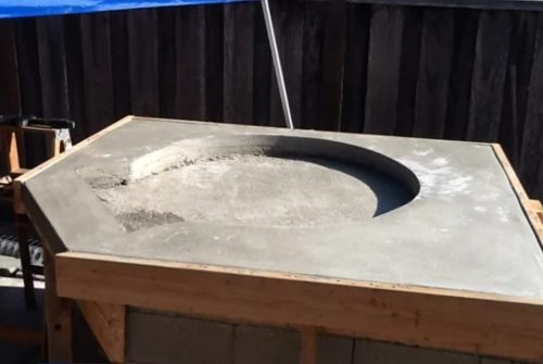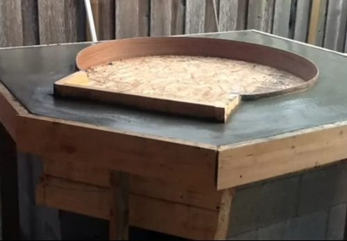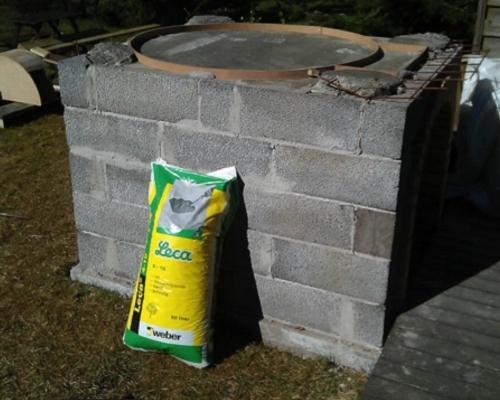 Tout d'abord, un cercle d'un diamètre de 95 à 105 cm est dessiné sur la surface de la table.Le long du bord extérieur, il est tapissé de morceaux de briques fixés avec du mortier. Il s'avère qu'il s'agit d'un anneau à l'intérieur duquel un matériau calorifuge est placé ou coulé (isolant en mousse, verre brisé, argile expansée, etc.). En dehors de l'anneau, la surface de la table est prolongée de béton, puis elle peut être recouverte de carreaux en pierre naturelle ou artificielle.