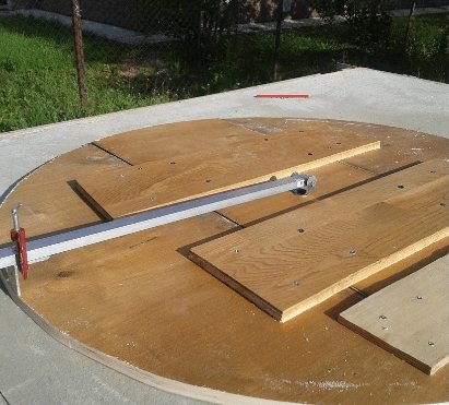| Installation d'un modèle. Pour disposer un hémisphère en brique, nous avons besoin d'un gabarit. Il existe plusieurs types de tels modèles, je vais montrer les plus courants, et vous décidez déjà lequel vous convient. Sur cette photo, le gabarit est un rail fixé à une charnière au centre du cercle. L'angle limite est attiré vers le rail par une pince, à la base se trouve une feuille de contreplaqué préfabriqué.