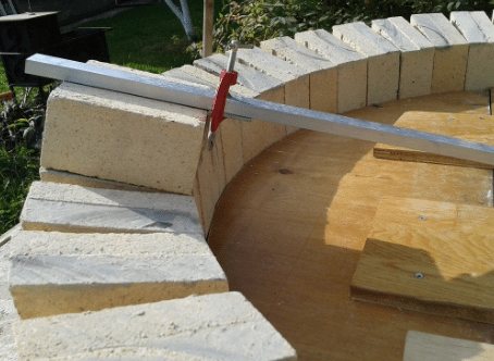 | Finition du dôme du four. A partir de la 8ème rangée, au fur et à mesure que nous nous déplacions vers le centre du dôme, les segments devaient être coupés de moins en moins, donc dans la dixième rangée j'ai déjà utilisé un cinquième de la brique, plus chaque pièce doit être essayée et coupée en place. |