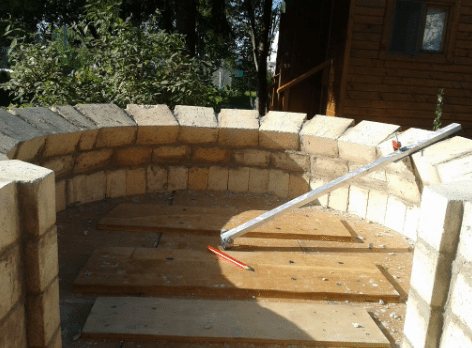 | Arches pour le podium. L'étape suivante n'est pas nécessaire, mais je voulais m'entraîner à poser des arcs en briques. Comme vous pouvez le voir sur la photo, 8 rangées de briques sur les côtés sont disposées exactement, puis un gabarit semi-circulaire pré-préparé est installé et avec son aide un arc est aménagé. De plus, jusqu'à ce que le mortier durcisse, des cales en bois temporaires sont insérées entre les blocs arqués. |