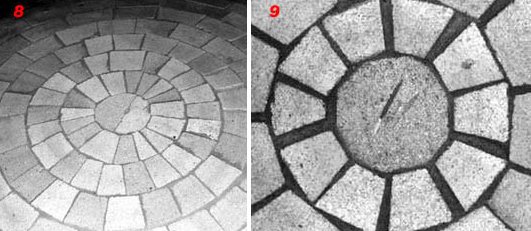 | Fixation du gabarit. La charnière de ce gabarit est vissée dans un trou pré-percé au centre du cercle et se règle avec un insert métallique. À la fin des travaux, le gabarit est retiré, la charnière est dévissé et le trou est entièrement recouvert de mortier. |