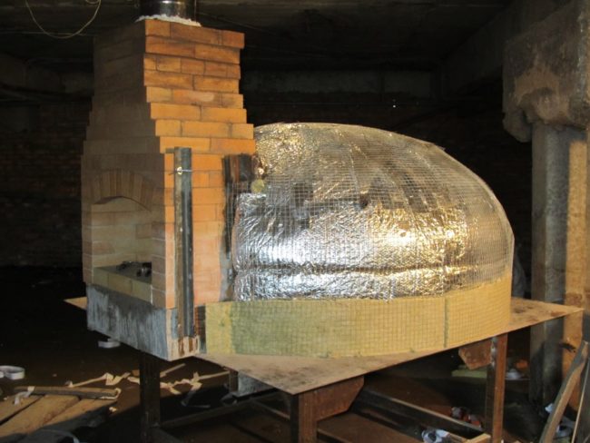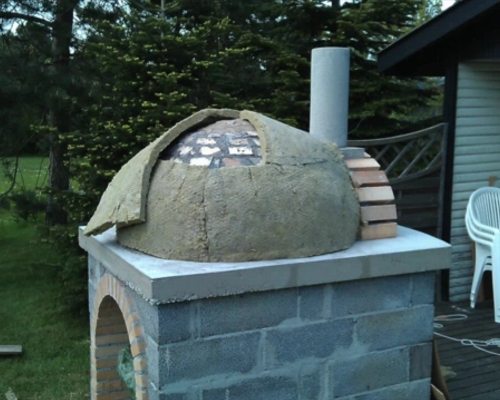En même temps, l'entrée du four avec une cheminée est formée. La cheminée est disposée à l'extérieur, en haut de l'entrée, et est en briques ou en tube sandwich métallique d'une hauteur d'au moins 2 m et d'un diamètre de 150-200 mm. Ensuite, le four sèche bien. Ce n'est qu'après séchage que le toit du four peut être recouvert d'une isolation thermique. Comme isolant, des fibres minérales sont utilisées, recouvertes d'un enduit de ciment, ou simplement une couche d'enduit de ciment-perlite est appliquée (dans un rapport de 1: 5).