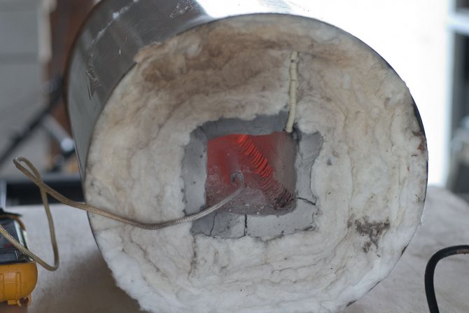 Le moufle en céramique obtenu est enveloppé de fil (nichrome ou féchral, 1 mm de diamètre) - il fonctionnera comme élément chauffant. Afin de fixer le fil au boîtier, celui-ci est recouvert d'une deuxième couche d'argile (qui est également séchée et cuite dans un four à charbon). Les extrémités du fil sont laissées ouvertes pour une connexion ultérieure au secteur.