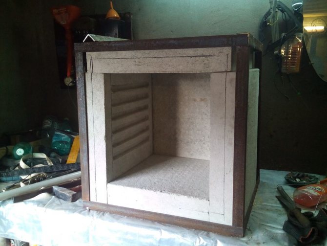 La chambre intérieure finie est placée dans un boîtier métallique. Il est soudé à partir de tôles d'acier d'une épaisseur de 2 mm ou plus. Des trous sont laissés dans le boîtier pour la connexion au fil chauffant.