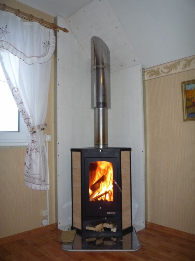 - La cheminée verticale traverse le plafond, cet endroit doit donc être entouré d'un matériau de lutte contre l'incendie - l'amiante. Si la cheminée est construite dans le coin de la pièce, il est alors nécessaire de protéger les deux murs avec un matériau calorifuge. Certains font de la maçonnerie entre la cheminée et le mur, d'autres utilisent des feuilles d'amiante.