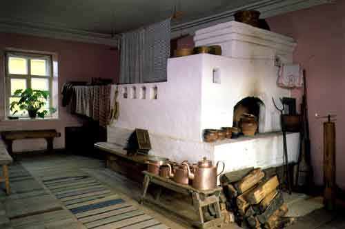 De tels fours étaient utilisés en Russie non seulement pour le chauffage et la cuisson, mais également pour traiter diverses maladies. Rhumes, grippes, douleurs rhumatismales, tout cela a été traité par chauffage au poêle. Voir le rideau. Il y a un canapé derrière. Sur elle, ils ont été traités et réchauffés.
